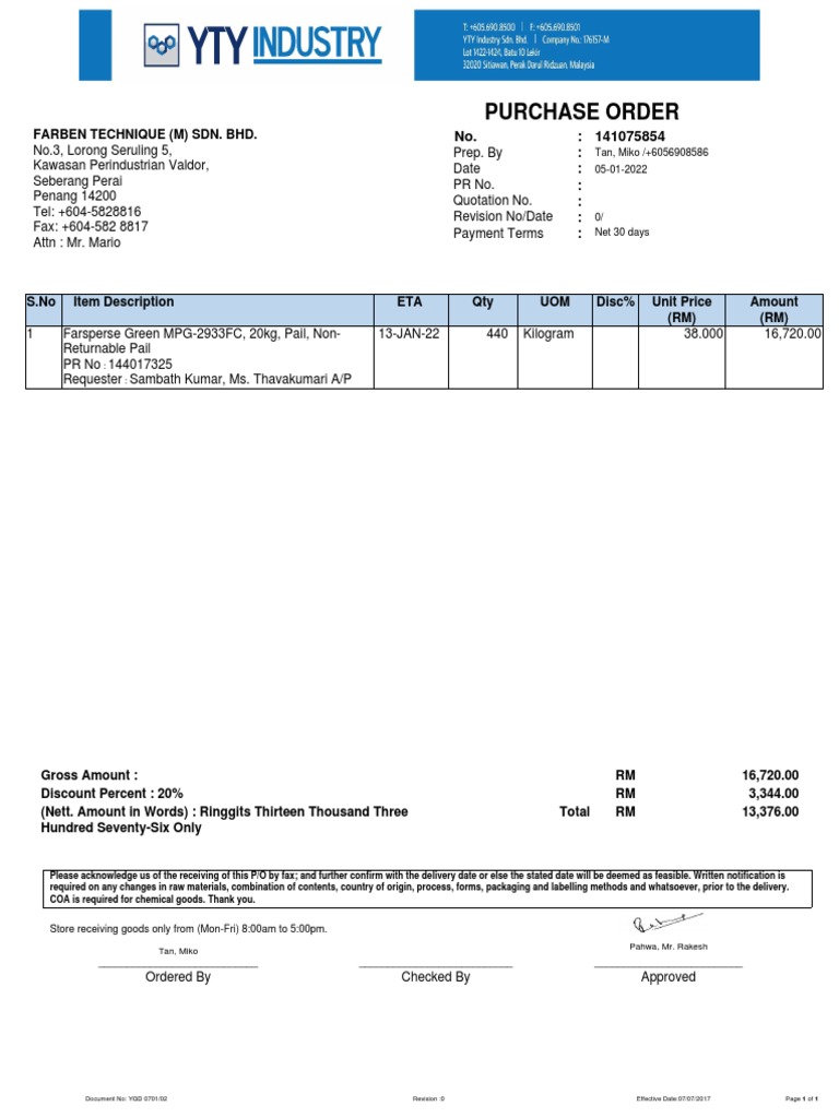 FARBEN TECHNIQUE (M) SDN. BHD. No. : 141075854