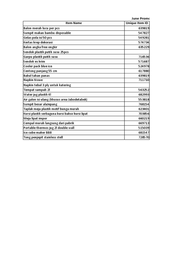 June Promo Item List - Data