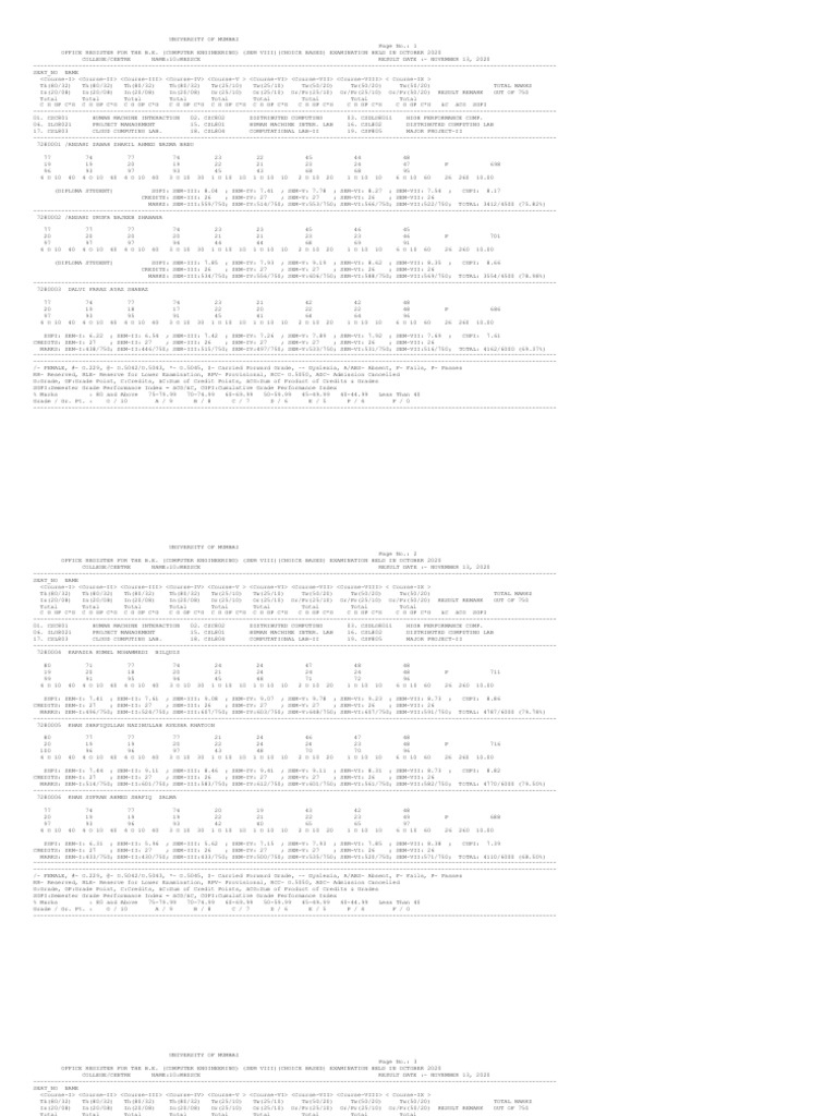 MARKS: SEM-I:449/750; SEM-II:482/750; SEM-III:463/800; SEM-IV:505/825; SEM-V:474/725; SEM-VI:492/725; SEM-VII:573/750; TOTAL: 4145/6075 (68.23%)