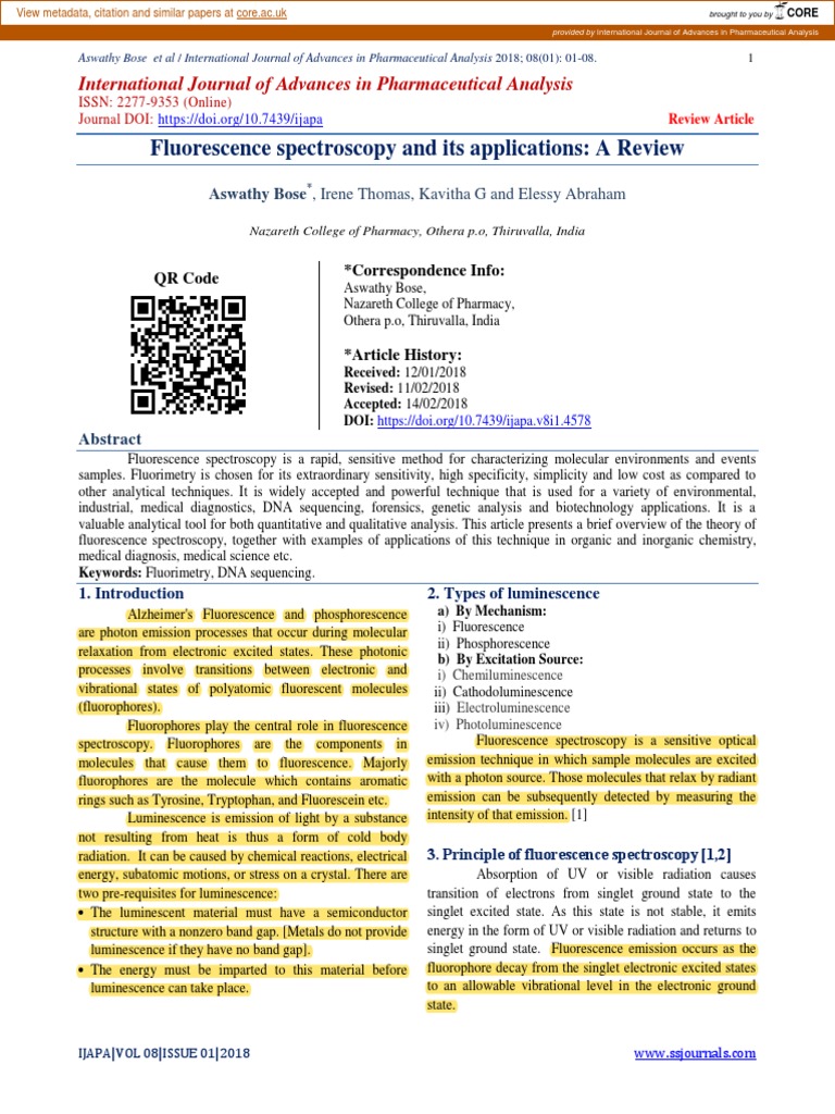 Aswathy Bose et al / Fluorescence spectroscopy and its applications: A Review 2