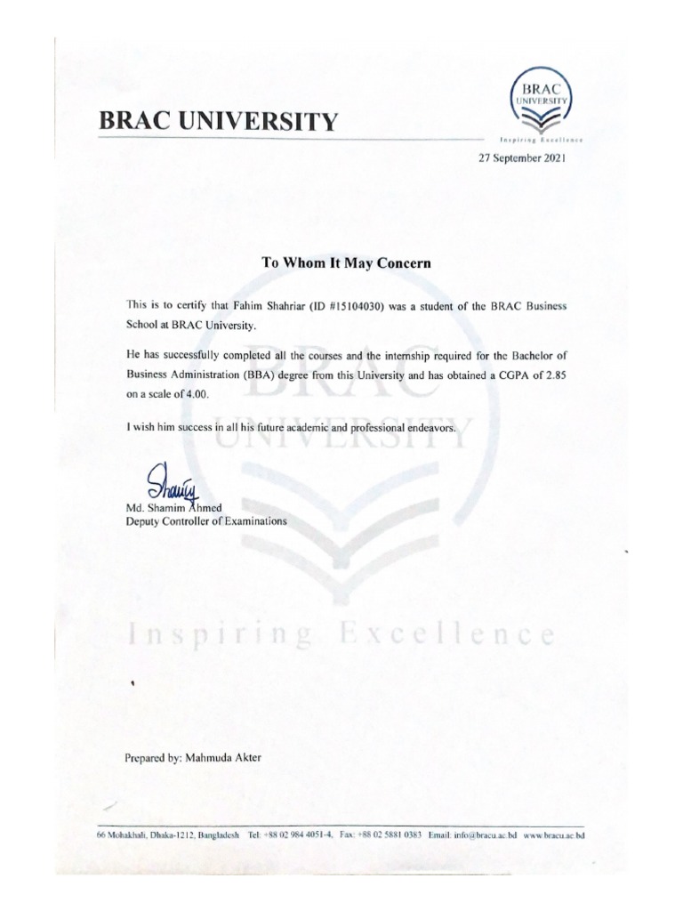 This is to certify that Fahim Shahriar (ID #15104030) was a student of the BRAC Business