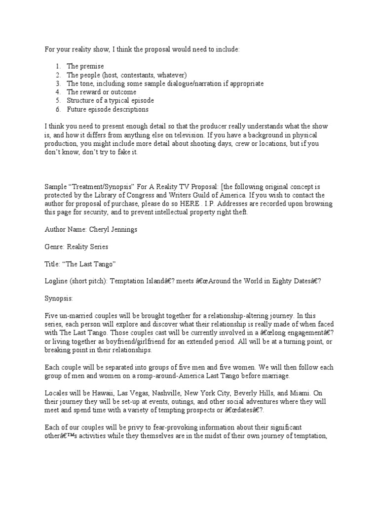 Sample “Treatment/Synopsis” For A Reality TV Proposal: [the following original concept is
