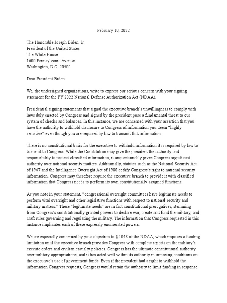 Coalition Letter Urges Biden Administration To Comply With Congressional Reporting Requirements