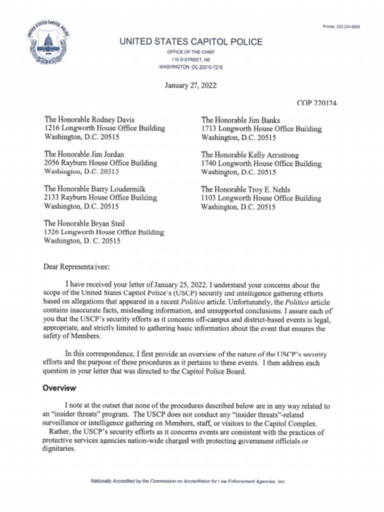 U. S. Capitol Police Response To CHA Minority Members Re Intelligence Activities