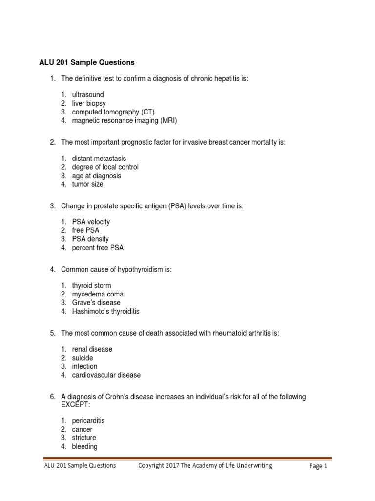 ALU 201 Sample Questions Copyright 2017 The Academy of Life Underwriting Page 1