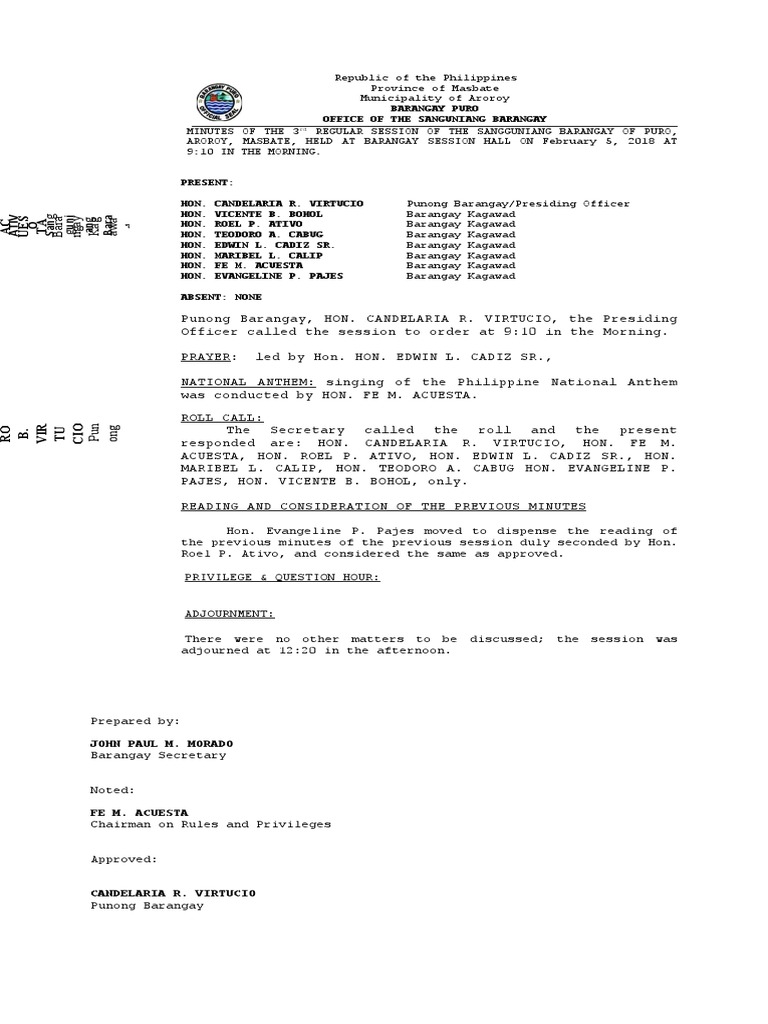 MINUTES OF THE 3rd REGULAR SESSION OF THE SANGGUNIANG BARANGAY OF PURO,