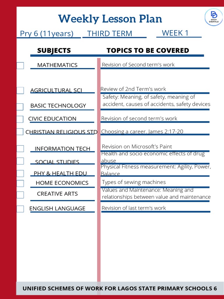 UNIFIED SCHEMES OF WORK FOR LAGOS STATE PRIMARY SCHOOLS 6
