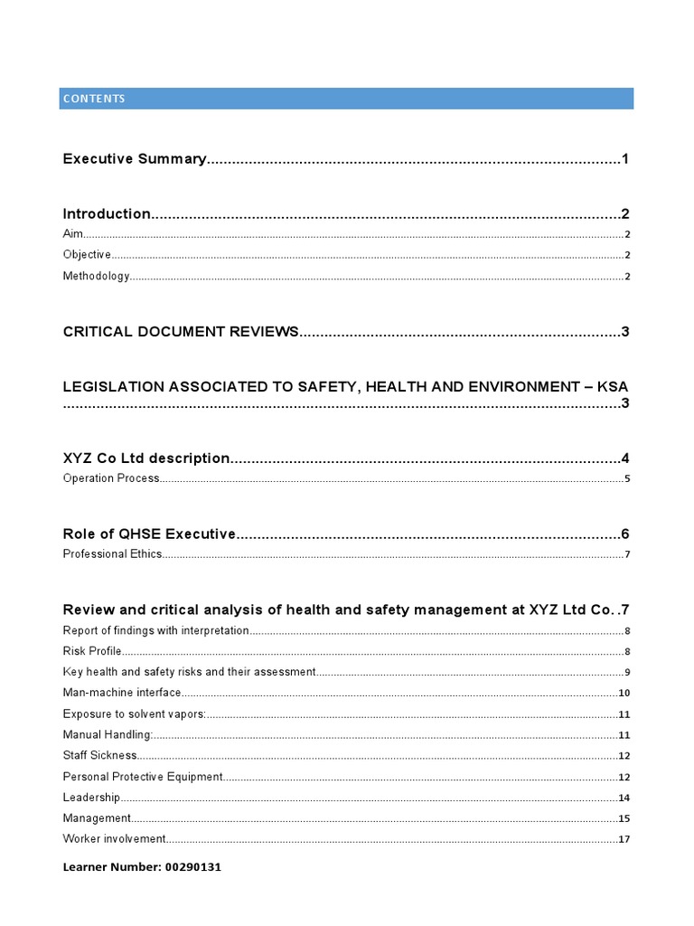 Review and critical analysis of health and safety management at XYZ Ltd Co. .7