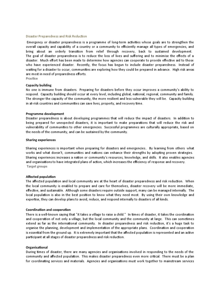 and political. Preparation may include building infrastructure, implementing early warning, increasing awareness