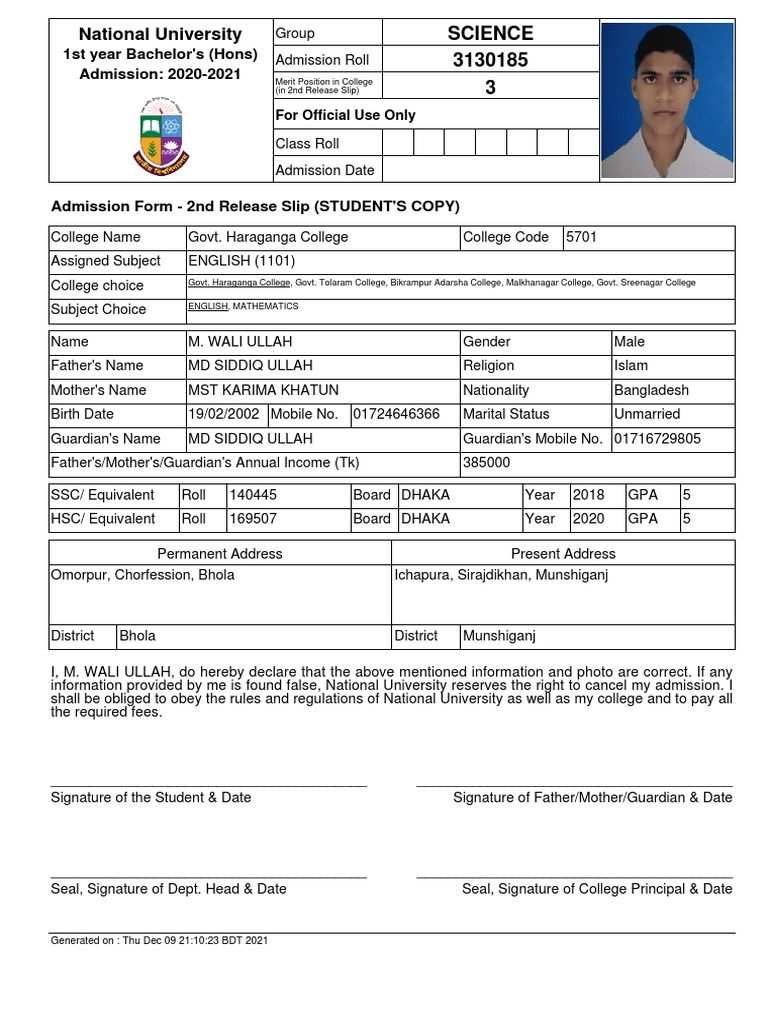Guardian's Name MD SIDDIQ ULLAH Guardian's Mobile No. 01716729805