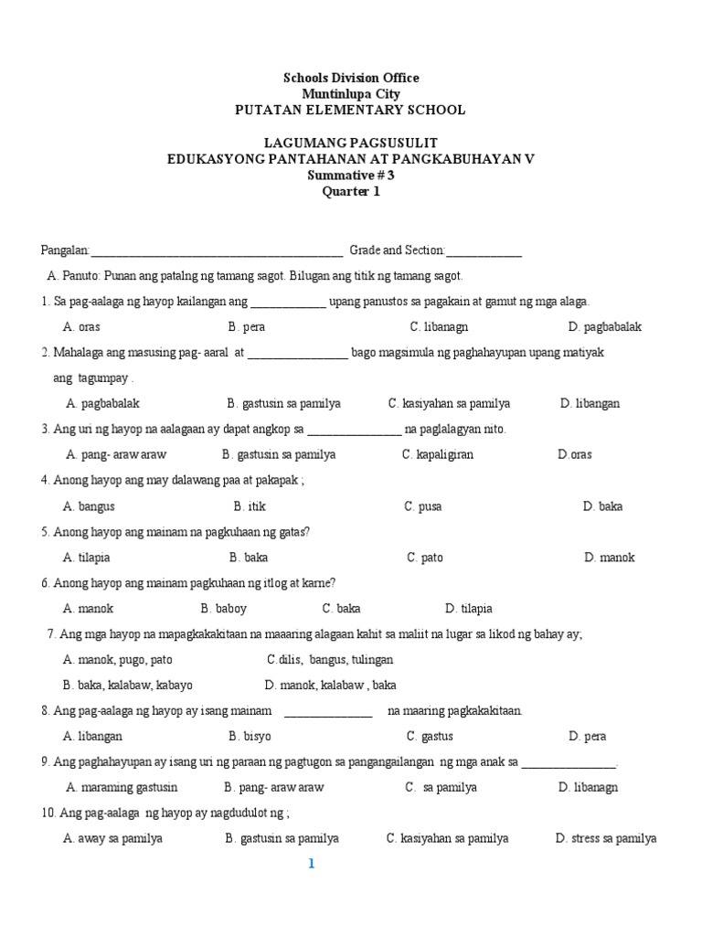 A. Panuto: Punan ang patalng ng tamang sagot. Bilugan ang titik ng tamang sagot.