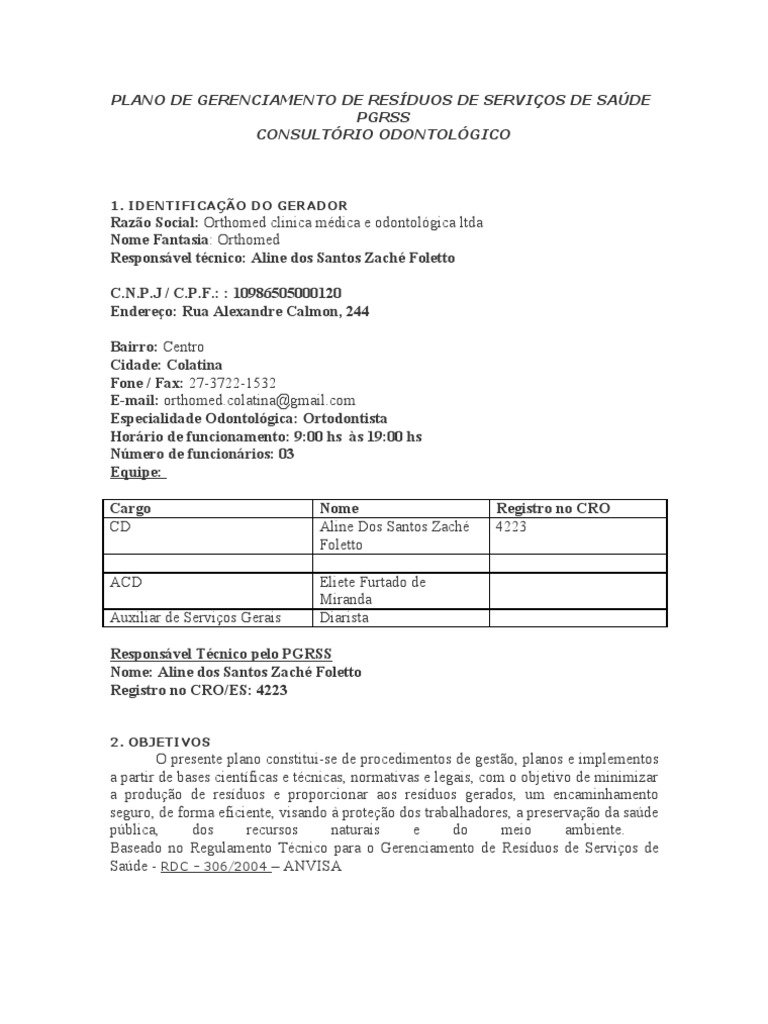 PLANO DE GERENCIAMENTO DE RESÍDUOS DE SERVIÇOS DE SAÚDE