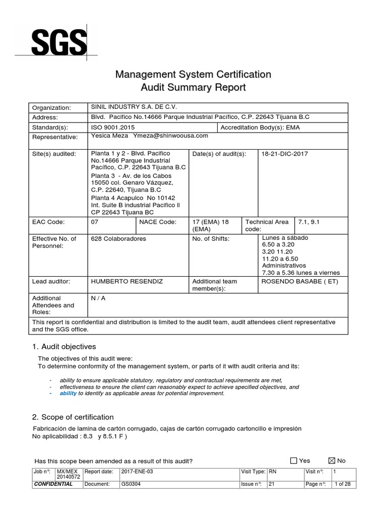 Site(s) audited: Planta 1 y 2 - Blvd. Pacifico Date(s) of audit(s): 18-21-DIC-2017