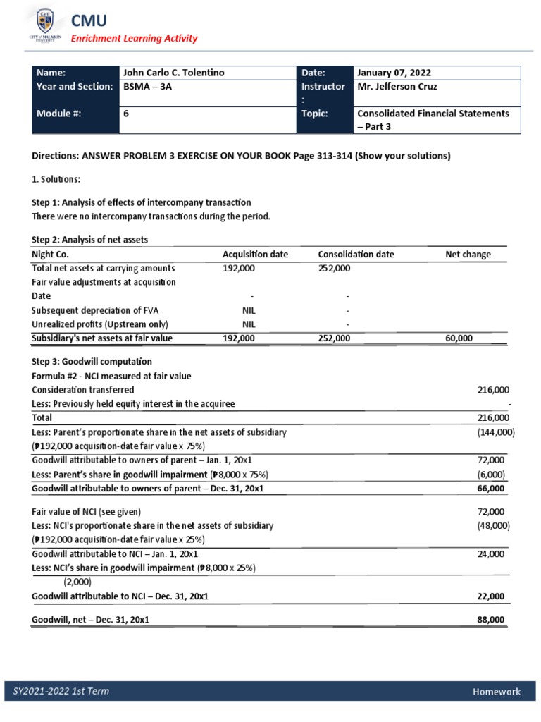 (a) Net change in Night’s net assets (Step 2) of ₱60,000 x 75% = ₱45,000.