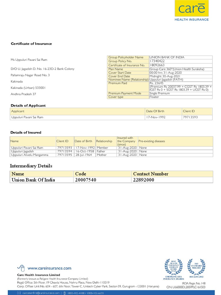 Policyholder Ms Uppuluri Pavani Sai Ram