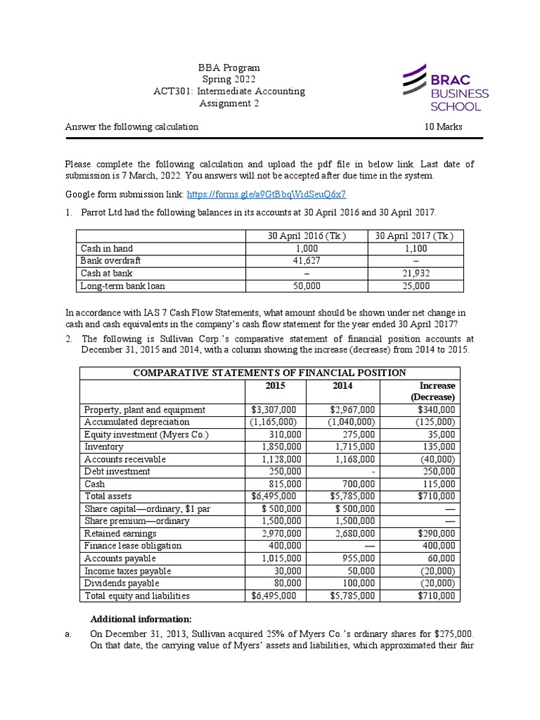 2. The following is Sullivan Corp.’s comparative statement of financial position accounts at