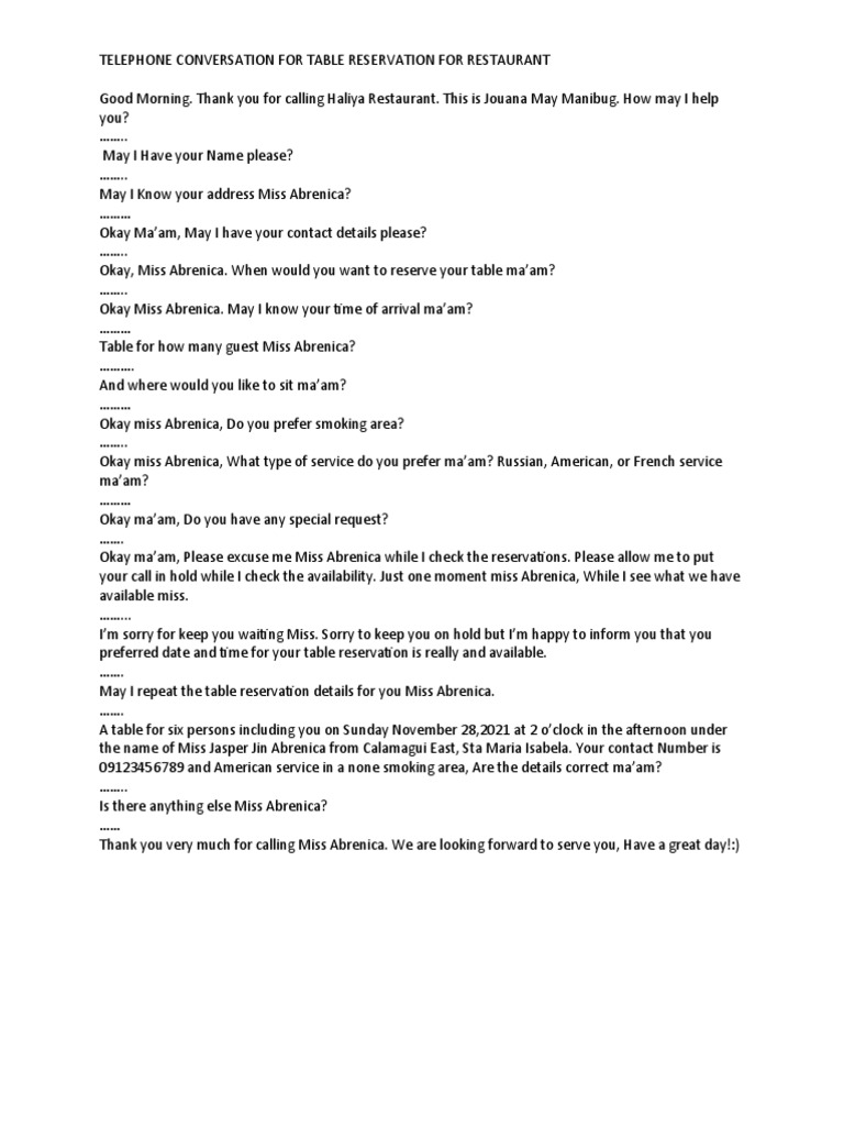 May I repeat the table reservation details for you Miss Abrenica.