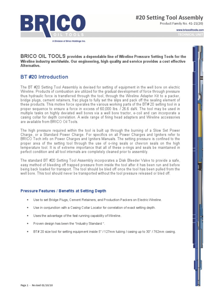 The BT #20 Setting Tool Assembly is devised for setting of equipment in the well bore on electric