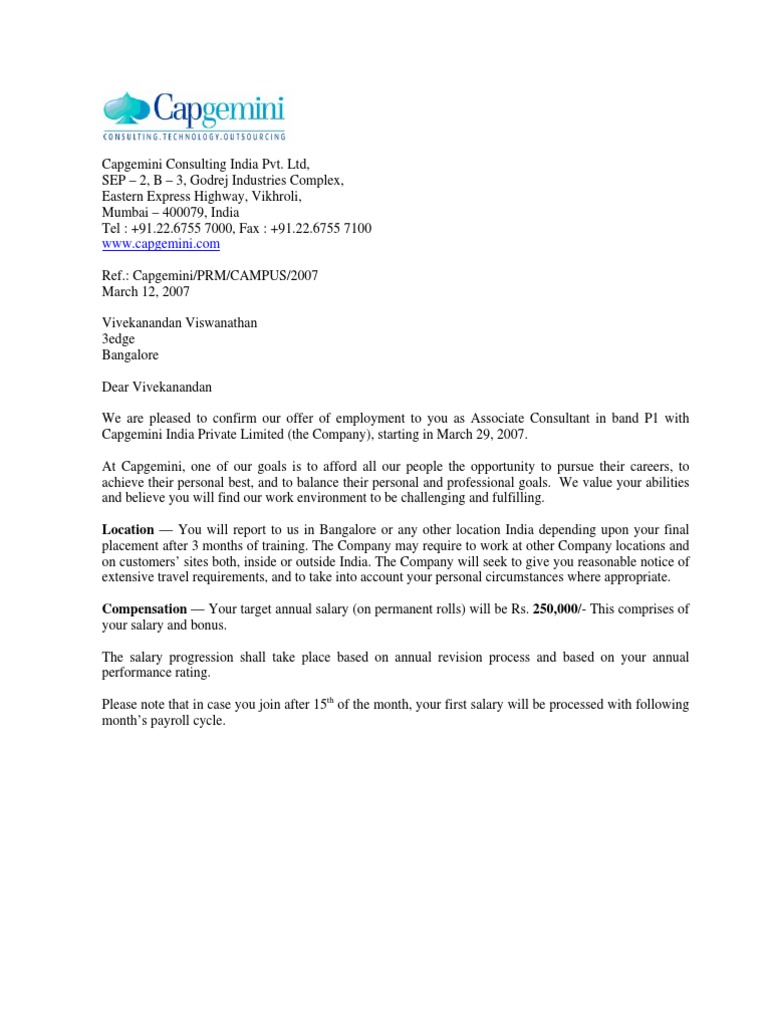 Compensation — Your target annual salary (on permanent rolls) will be Rs. 250,000/- This comprises of