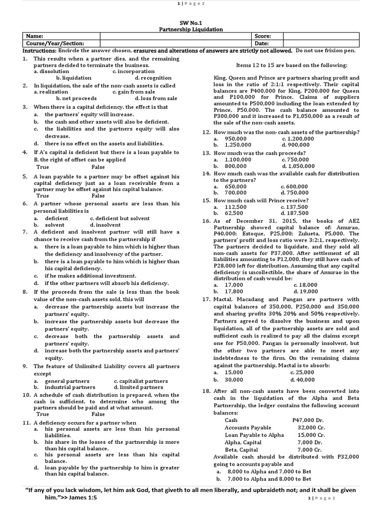 4. If A’s capital is deficient but there is a loan payable to 13. How much was the cash proceeds?