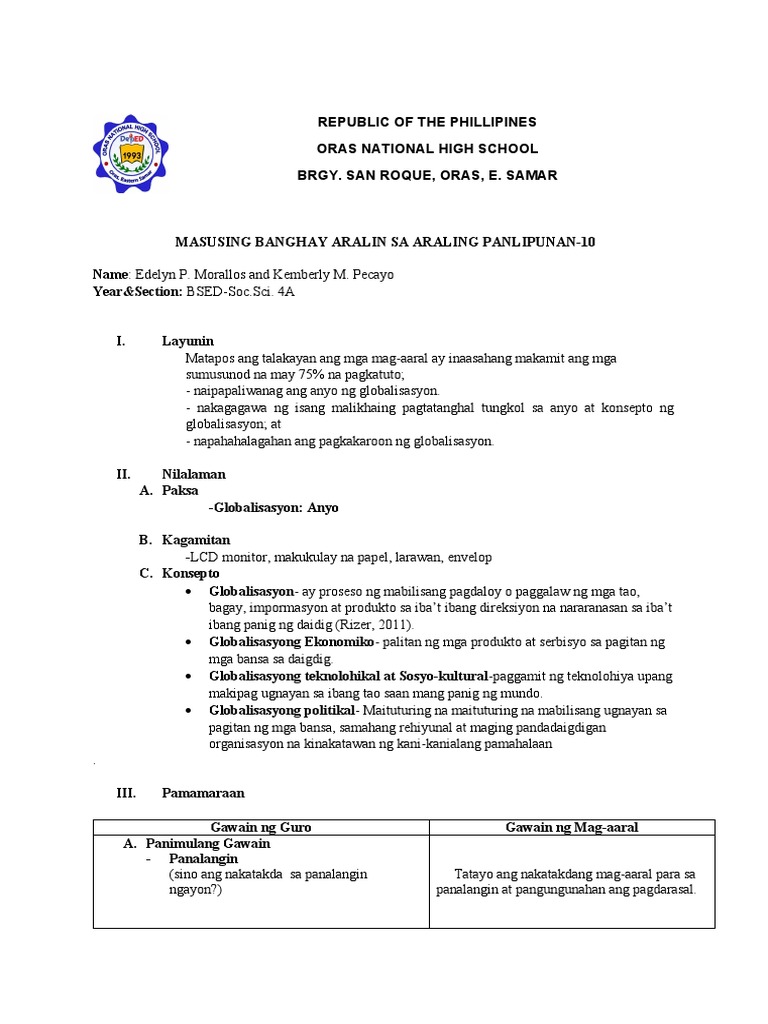 MASUSING BANGHAY ARALIN SA ARALING PANLIPUNAN-10