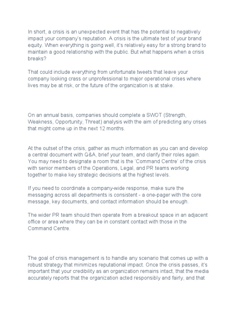 impact your company’s reputation. A crisis is the ultimate test of your brand