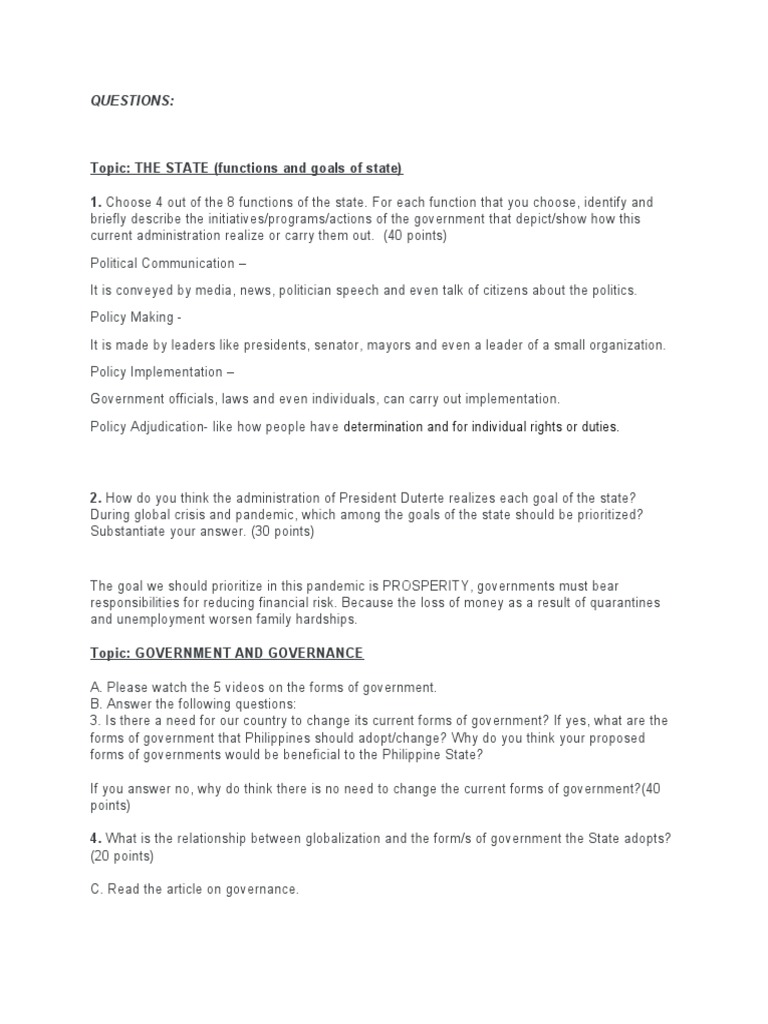 2. How do you think the administration of President Duterte realizes each goal of the state?