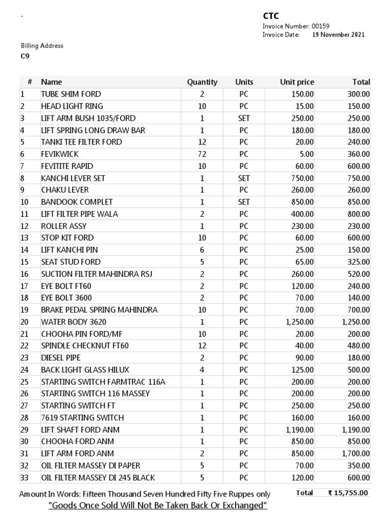 Amount In Words: Fifteen Thousand Seven Hundred Fifty Five Ruppes only Total ₹ 15,755.00