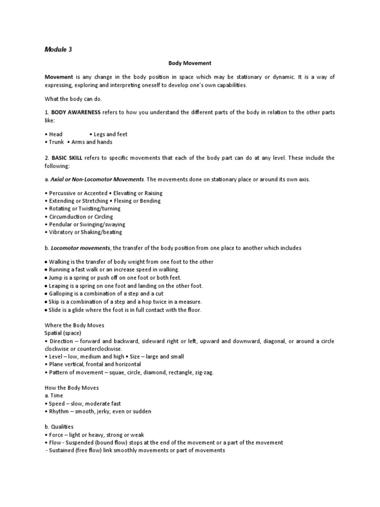 2. BASIC SKILL refers to specific movements that each of the body part can do at any level. These include the