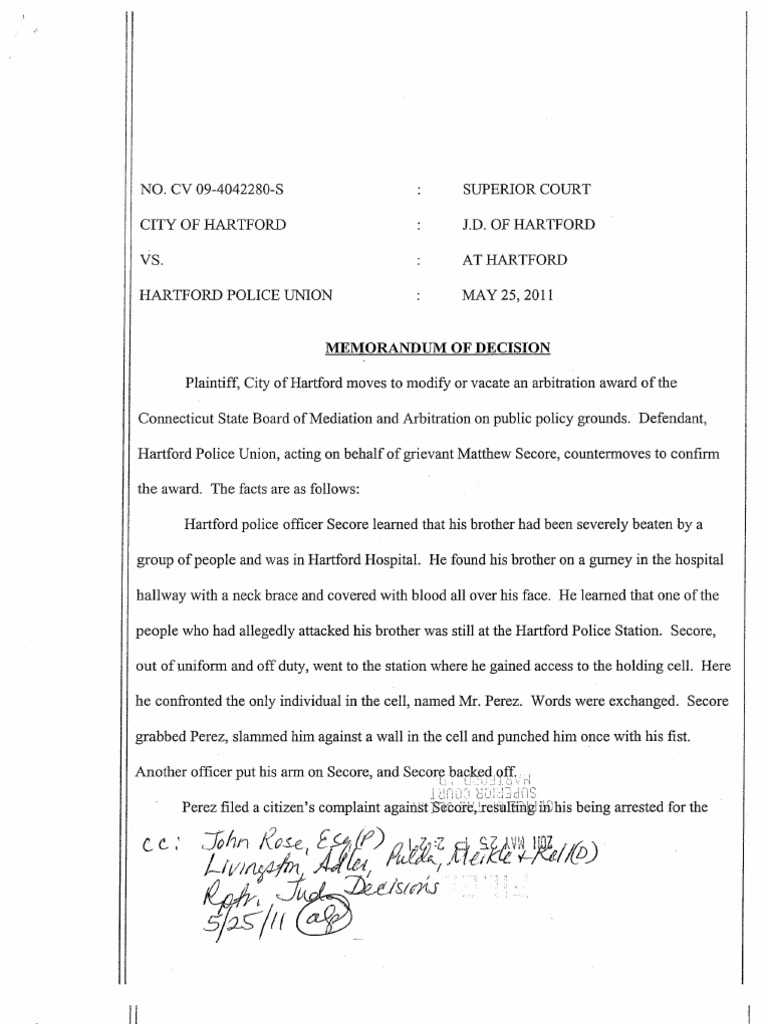 City of harford seeks to modify or vacate arbitration award on public policy grounds. Harford police officer Matthew Secore was disciplined for conduct unbecoming a police officer. Secore slammed his brother against a wall in the cell and punched him once with his fist. The union, on behalf of secore, grieved the discipline and the matter came to arbitration.