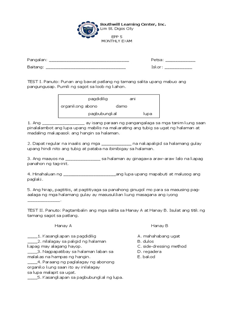 TEST II. Panuto: Pagtambalin ang mga salita sa Hanay A at Hanay B. Isulat ang titik ng