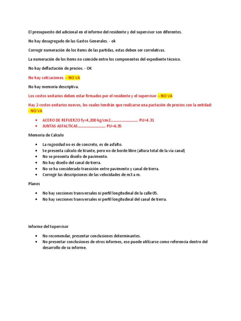 Los costos unitarios deben estar firmados por el residente y el supervisor – NO VA
