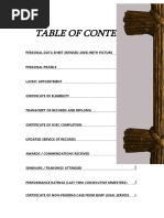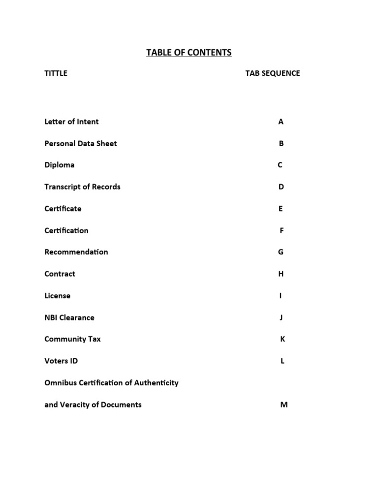 The document lists the table of contents for various sections including a letter of intent, personal data sheet, diploma, transcript of records, certificate, certification, recommendation, contract, license, NBI clearance, community tax, voters ID, and an omnibus certification of authenticity and veracity of documents.