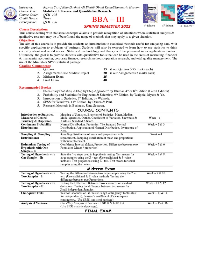 This course dealing with statistical concepts & aims to provide recognition of situations where statistical analysis &
