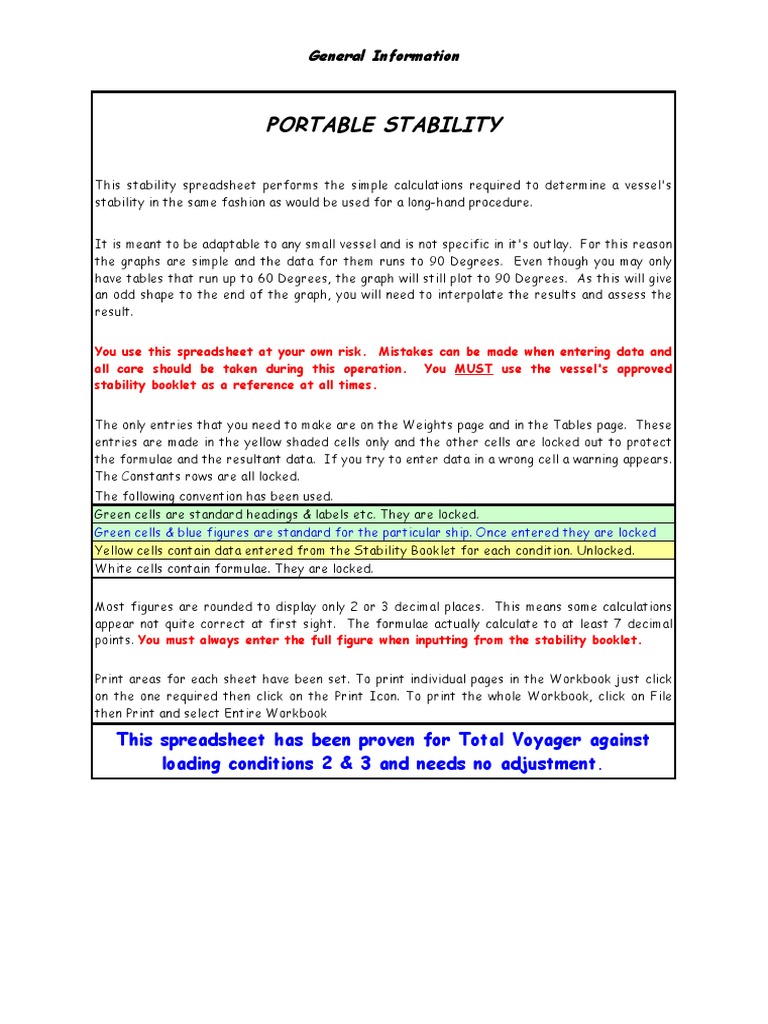 This stability spreadsheet performs the simple calculations required to determine a vessel's