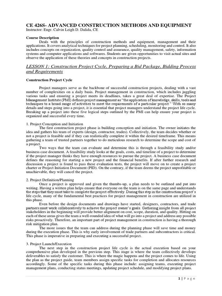 LESSON 1: Construction Project Cycle, Preparing a Bid Package, Bidding Process