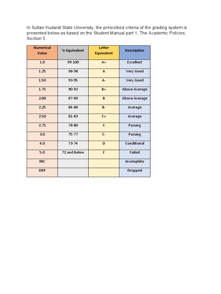 In Sultan Kudarat State University, the prescribed criteria of the grading system is