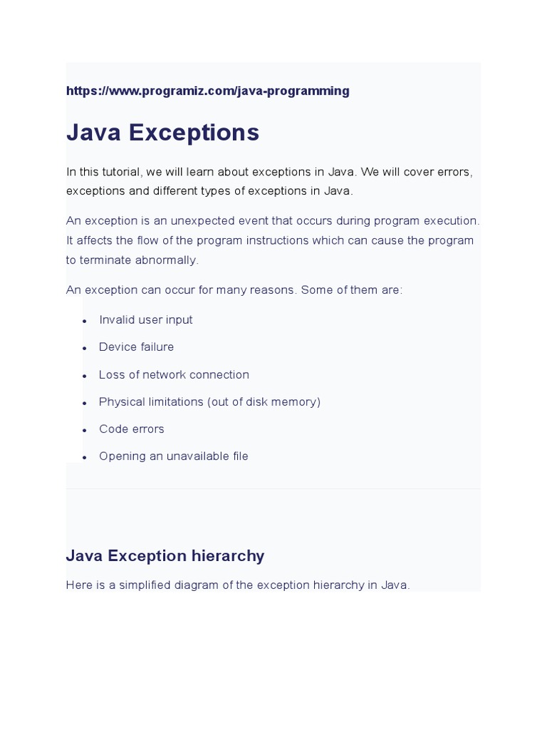 In this tutorial, we will learn about exceptions in Java. We will cover errors,