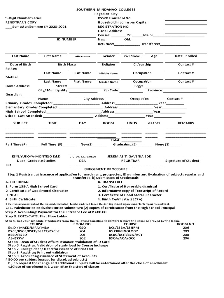 Step 1 Registrar: a) Issuance of application for enrolment, prospectus, ID number and Evaluation of subjects regular and