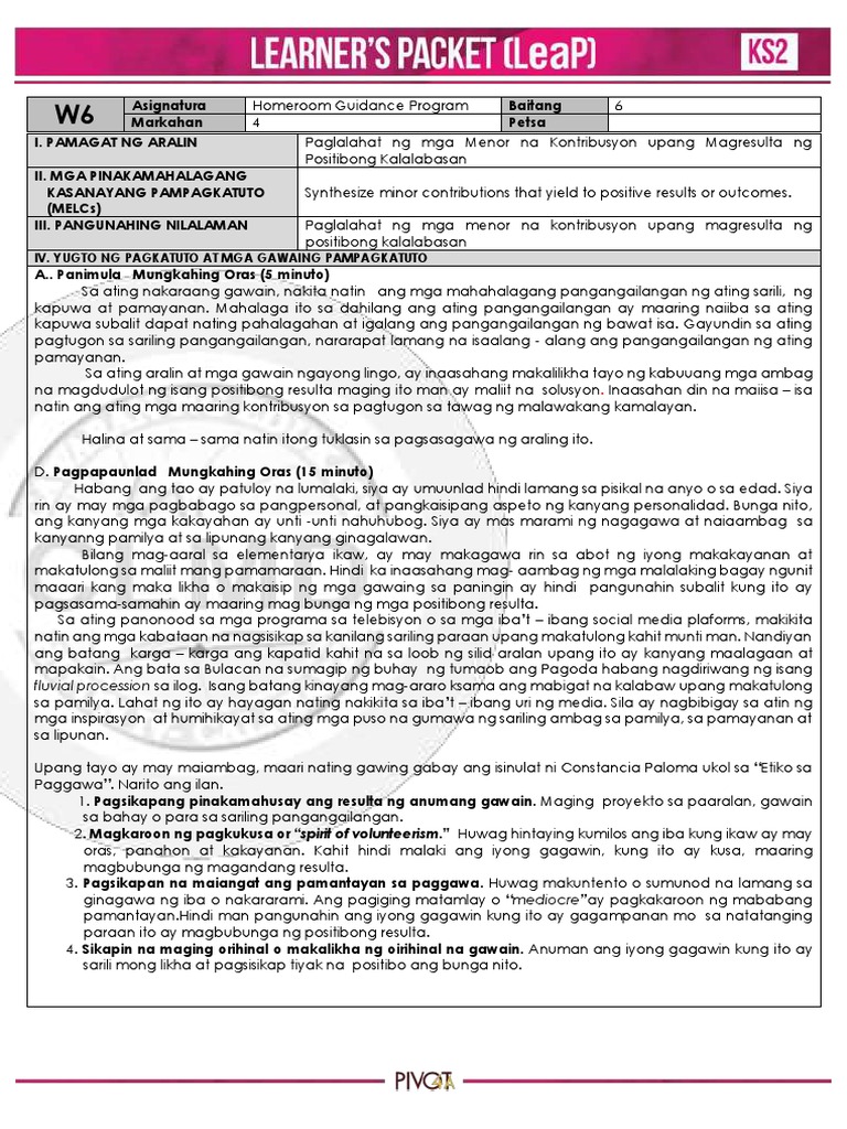 KASANAYANG PAMPAGKATUTO Synthesize minor contributions that yield to positive results or outcomes.