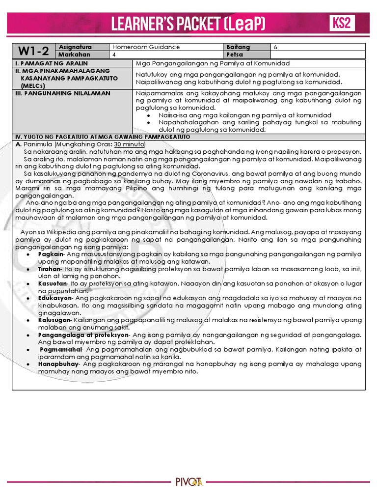 I. PAMAGAT NG ARALIN Mga Pangangailangan ng Pamilya at Komunidad