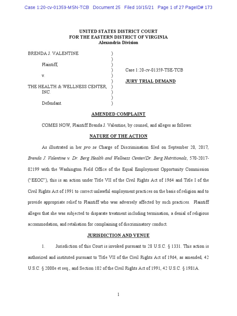 4. Plaintiff Brenda J. Valentine (“Ms. Valentine”) is a resident of the District of Columbia and a Christian (“Evangelist”). She began working for Defendant beginning in 2010 and rose to the rank of Director of Marketing Assistance/New Client Scheduler. She was subsequently demoted and then terminated on or about April 12, 2017. 5. Defendant The Health & Wellness Center, Inc. (“Defendant”) is a Virginia corporation owned by Eric E. Berg (“Dr. Berg”) and his wife Karen Berg (“Mrs. Berg”). Dr. and Mrs. Berg each served as Ms. Valentine’s supervisor and had active roles in hiring, firing, and disciplining employees including Ms. Valentine. Defendant operates under a fictitious name registered in Fairfax County and the City of Alexandria, “Dr. Berg Nutritionals.” Defendant has continuously been doing business in the Commonwealth of Virginia and has continuously had at least fifteen (15) employees.