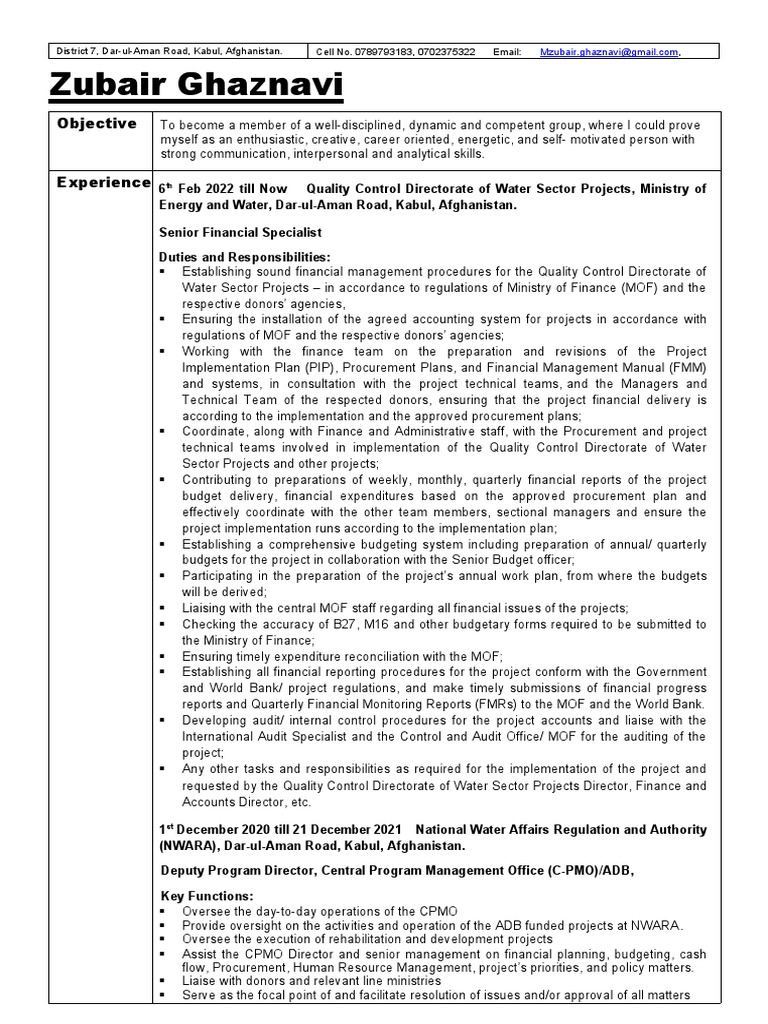 District 7, Dar-ul-Aman Road, Kabul, Afghanistan. Cell No. 0789793183, 0702375322 Email: [Link]@gmail.