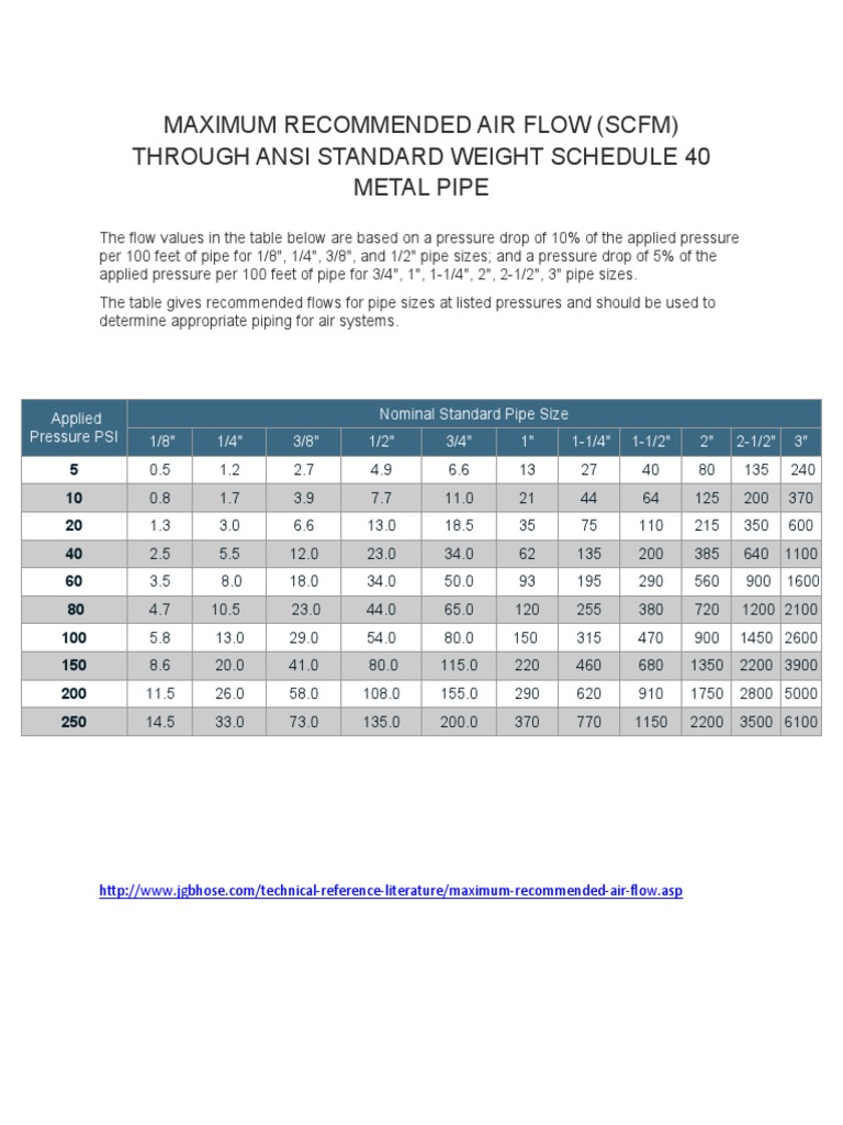 per 100 feet of pipe for 1/8", 1/4", 3/8", and 1/2" pipe sizes; and a pressure drop of 5% of the