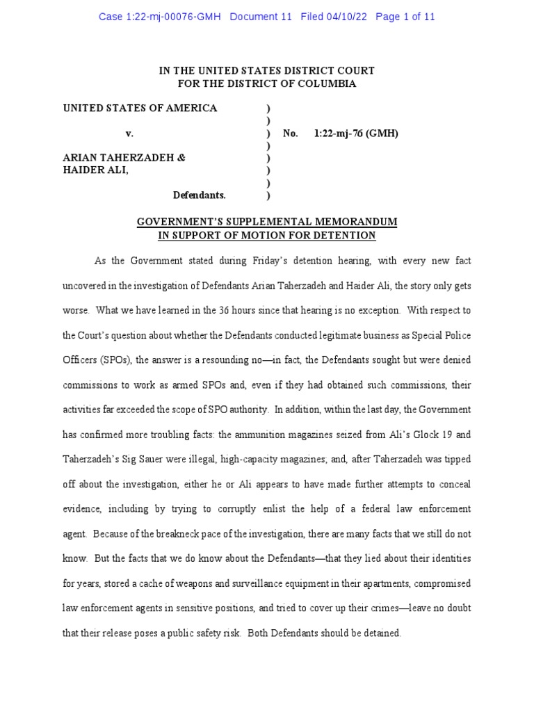 IN THE UNITED STATES DISTRICT COURT FOR THE DISTRICT OF COLUMBIA UNITED STATES OF AMERICA ) ) v. ) No. 1:22-mj-76 (GMH) ) ARIAN TAHERZADEH & ) HAIDER ALI, ) ) Defendants. ) GOVERNMENT’S SUPPLEMENTAL MEMORANDUM IN SUPPORT OF MOTION FOR DETENTION