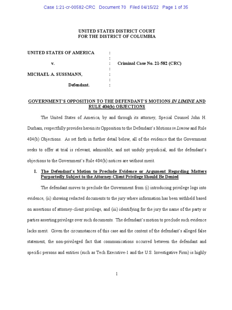 70 - Memorandum in Opposition Re Sussmann Motion in Limine by USA