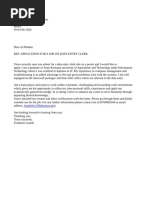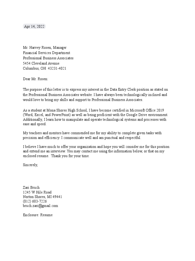 The purpose of this letter is to express my interest in the Data Entry Clerk position as stated on