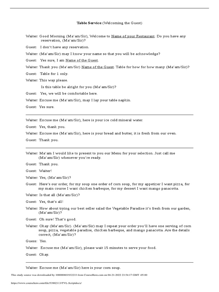 Waiter: Thank you (Ma’am/Sir) Name of the Guest. Table for how for how many (Ma’am/Sir)?