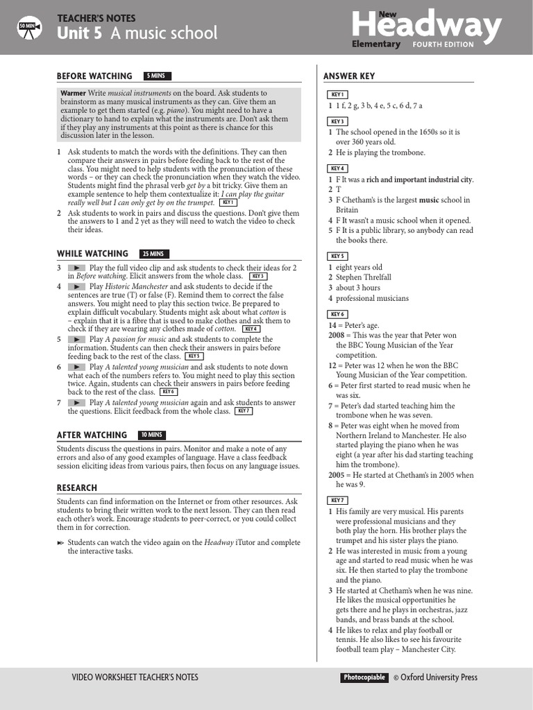 Students can watch the video again on the Headway iTutor and complete trumpet and his sister plays the piano.