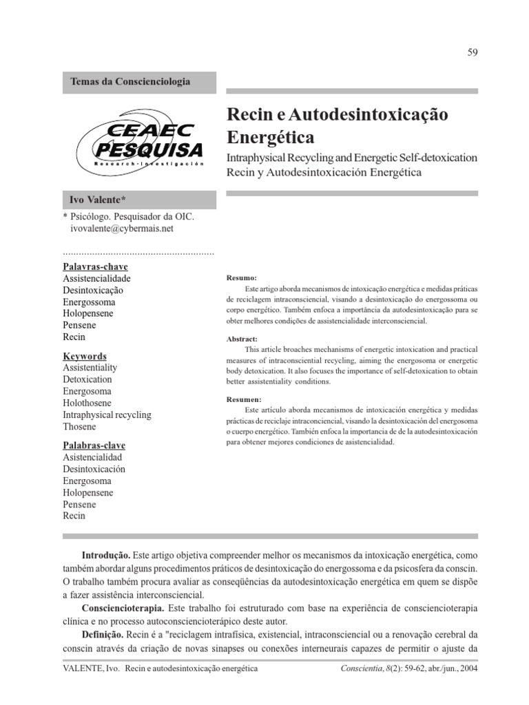 VALENTE, Ivo. Recin e autodesintoxicação energética Conscientia, 8(2): 59-62, abr./jun., 2004